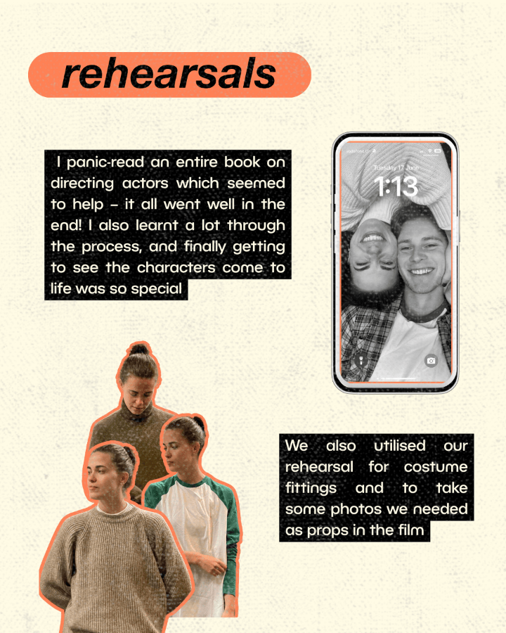 I had scheduled rehearsals with all the main cast in the week before the shoot (in hindsight, way too late…), but we all finally got to meet in person. A few days before the rehearsals I panicked, as I’d never led a rehearsal for a narrative film before and didn’t really know what to do with my actors. I panic-read an entire book on directing actors which seemed to help – it all went well in the end! I also learnt a lot through the process, and finally getting to see the characters come to life was so special. We also utilised our rehearsal for costume fittings and to take some photos we needed as props in the film.