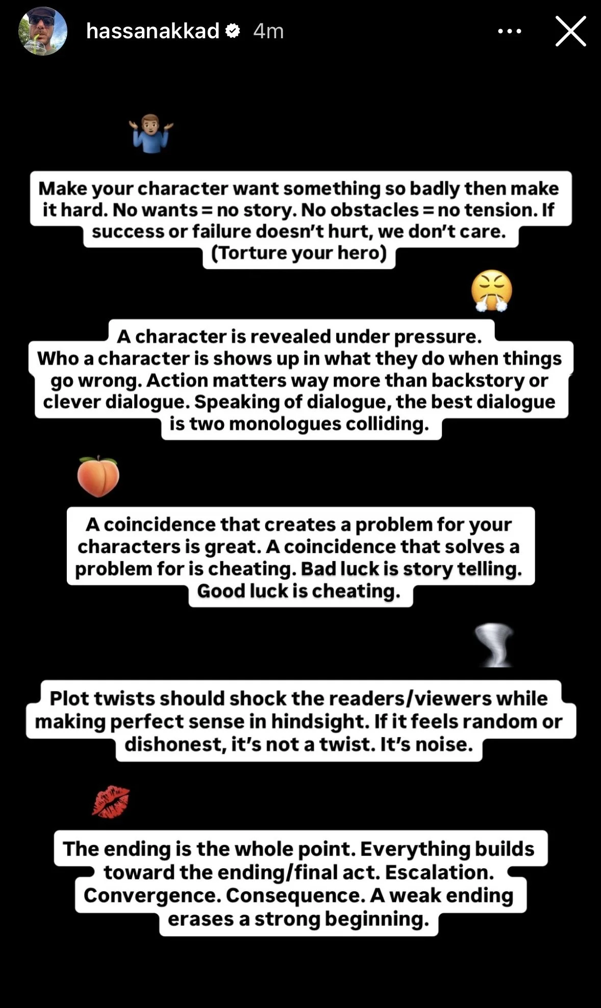He recently shared his top tips for narrative storytelling on his Instagram story, and has shared his script White Stain with Short Stuff to provide a practical example of how these notes apply.
